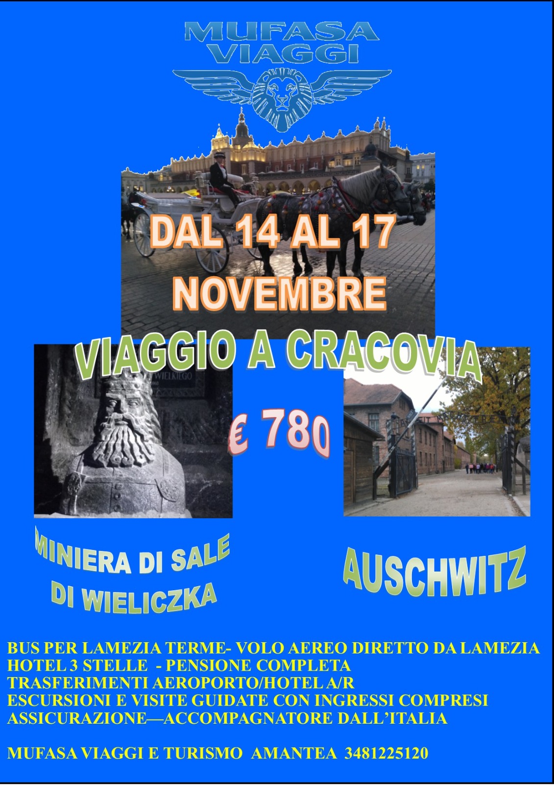 Prezzo per persona in camera doppia € 780,00 Prezzo per persona in camera singola € 840,00 Comprende: Bus fino all’aeroporto di Lamezia Terme Andata e Ritorno Volo Aereo diretto da Lamezia per Cracovia Andata e Ritorno con bagaglio a mano di 10 kg e borsa personale(zainetto). Accompagnatore d’agenzia. Pensione completa (i pasti consistono in 1 piatto, 2 piatto, dessert, pane e acqua) secondo il programma: dalla cena del primo giorno al pranzo dell’ultimo giorno. Servizio del pullman per il trasferimento dall’aeroporto di Cracovia all’hotel e viceversa. Escursione alla Miniera di Sale e ad Auscwitz. Visite guidate in italiano con guide locali: visita di Cracovia centro storico, visita del museo Auschwitz-Birkenau con la guida locale; le cuffie obbligatorie incluse nel prezzo; visita della miniera di sale a Wieliczka con la guida locale, con le entrate; assicurazione medica e di viaggio; Il prezzo non include: mance e spese personali; facchinaggio; tutto non citato nella voce Comprende. DOCUMENTO: CARTA D’IDENTITA’ ELETTRONICA O PASSAPORTO VALIDI. ACCONTO ALLA PRENOTAZIONE € 400,00 - SALDO ENTRO IL 30 OTTOBRE.